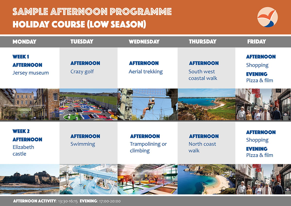 Nach dem morgendlichen Unterricht können unsere Schüler bei den Nachmittagsaktivitäten voll auskosten, was Jersey zu bieten hat. Kinder haben so die Möglichkeit, aus einer Vielzahl von Aktivitäten auszuwählen, wie Wassersport, Kulturbesuche, Strandbesuche und Indoor-Sport auszuprobieren.