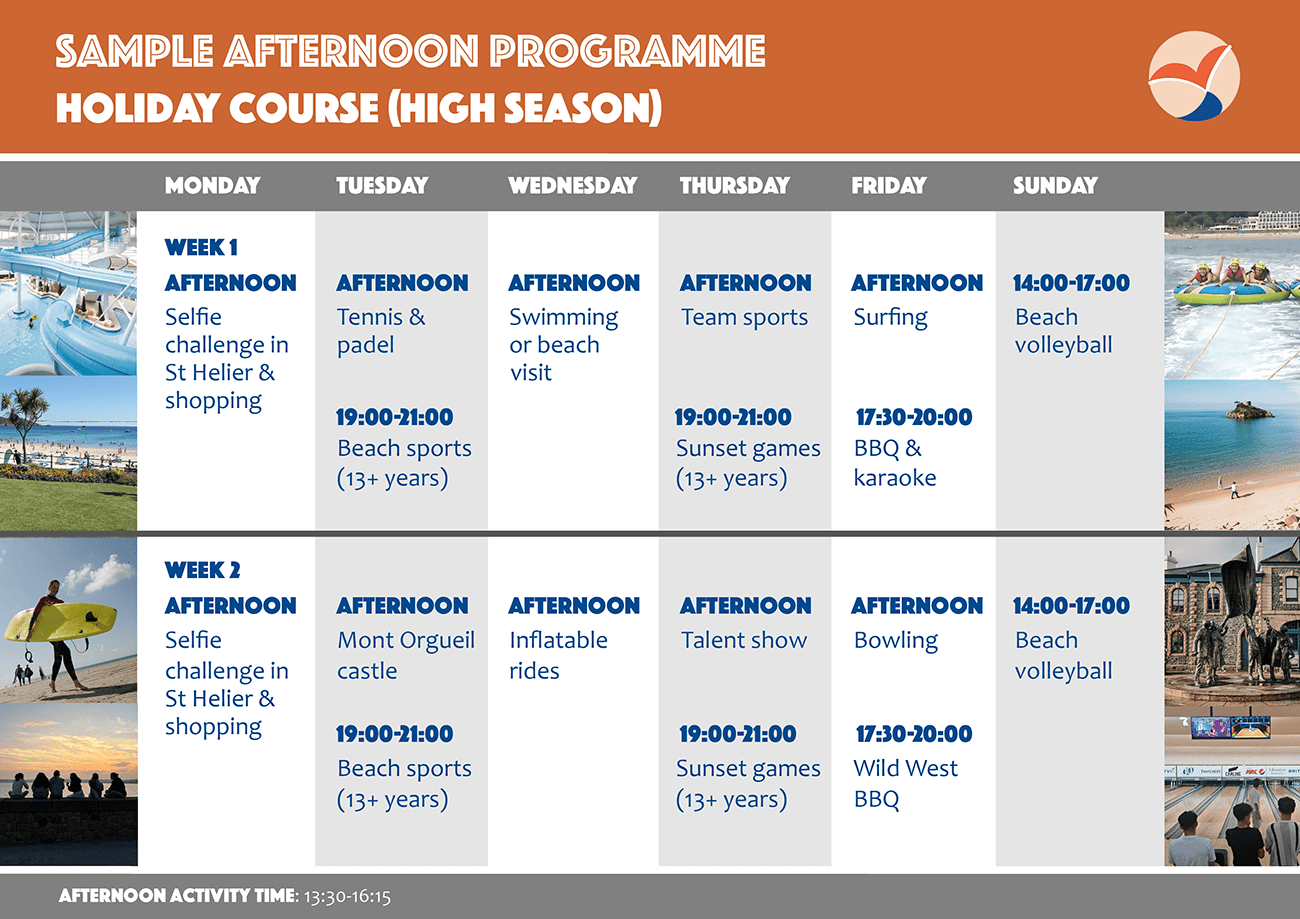 Nota: En temporada baja, el programa de actividades se basa en visitas deportivas y culturales, más que en actividades al aire libre y de playa. Si nos vemos obligados a cancelar una actividad o excursión por mal tiempo u otro motivo inevitable, será sustituida por otra actividad típica de nuestro programa.