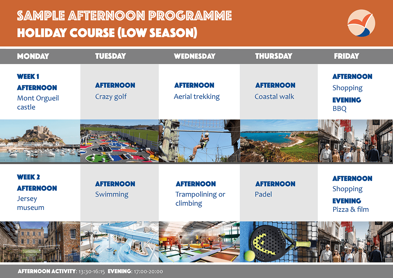 Las clases de la mañana se complementan con actividades por la tarde que aprovechan al máximo todo lo que Jersey tiene que ofrecer, brindando a los niños la oportunidad de disfrutar de una amplia variedad de experiencias, como deportes acuáticos, visitas culturales, visitas a la playa y deportes de interior.
